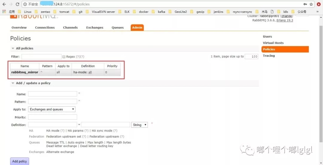 使用Rabbit镜像功能,需要基于rabbitmq策略来实现,策略是用来控制和修改群集范围的某个vhost队列行为和Exchange行为,在cluster中任意节点启用策略,策略会自动同步到集群节点。